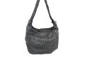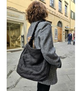 Hand-woven washed leather bag with long machined handle - BLACK